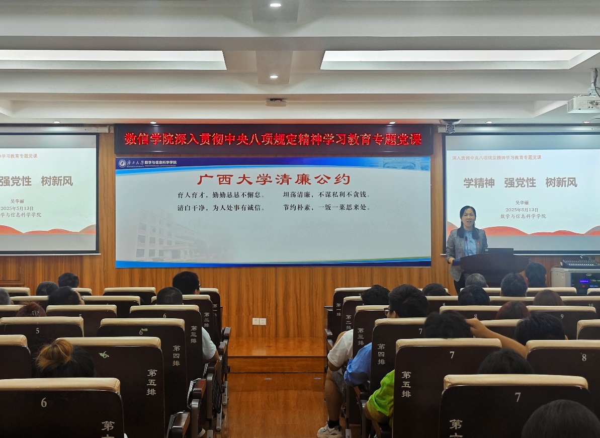 5月13日下午,院党委书记吴华丽以“学精神 强党性 树新风”为题,为永利官网100余名师生党员讲授深入贯彻中央八项规定精神学习教育专题党课。